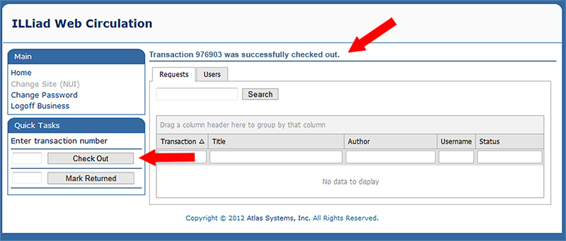 Alma is not linked to Interlibrary Loan; staff must use a separate system, ILLiad (ILLiad Web Circulation). An Icon for ILLiad appears on the desktop, and there is a link on Dashboard (staff home page). ILLiad requires a separate ID and password.